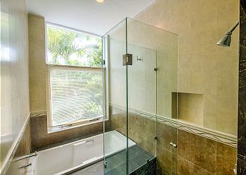 Bedroom 2 (Upstairs – Master Suite): King bed, walk-in double closet, large en-suite bathroom, stunning lagoon view.