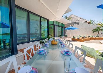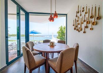 The minimalist yet elegant décor complements the natural beauty surrounding the home, creating a peaceful, contemporary atmosphere. The dining room overlooks the lagoon and features a large table that comfortably seats up to 12 guests—perfect for group meals or special celebrations.