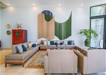 Inside, the villa boasts a spacious 900-square-foot living area designed to bring the outdoors in. With soaring 15-foot ceilings, an interior garden, and floor-to-ceiling glass windows, the space feels open, bright, and refreshingly airy.